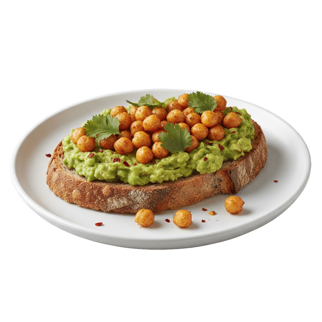 Una base de pan de masa madre artesanal con aguacate cremoso, coronada con garbanzos crujientes y especiados, cilantro fresco y un toque de lima.