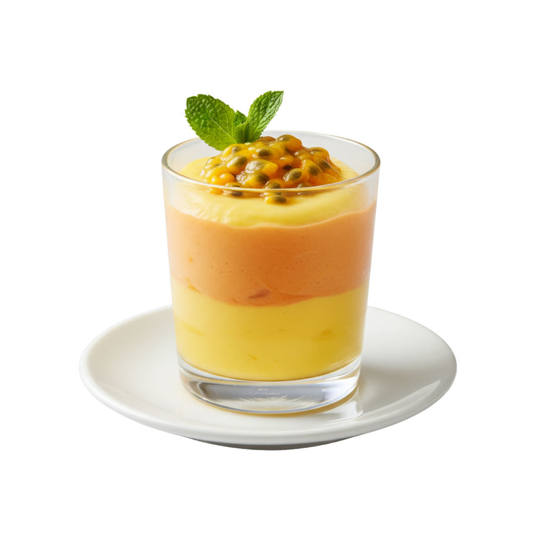 Un postre ligero, aireado y lleno de sabor tropical. La dulzura del mango se equilibra a la perfección con la acidez del maracuyá.