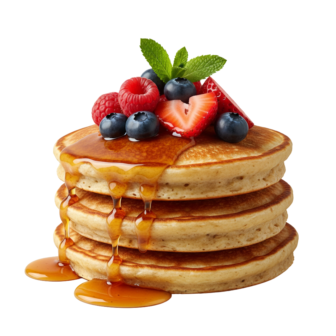 Una torre de pancakes esponjosos hechos con harina de avena, endulzados naturalmente y acompañados de frutos rojos frescos y sirope de agave.