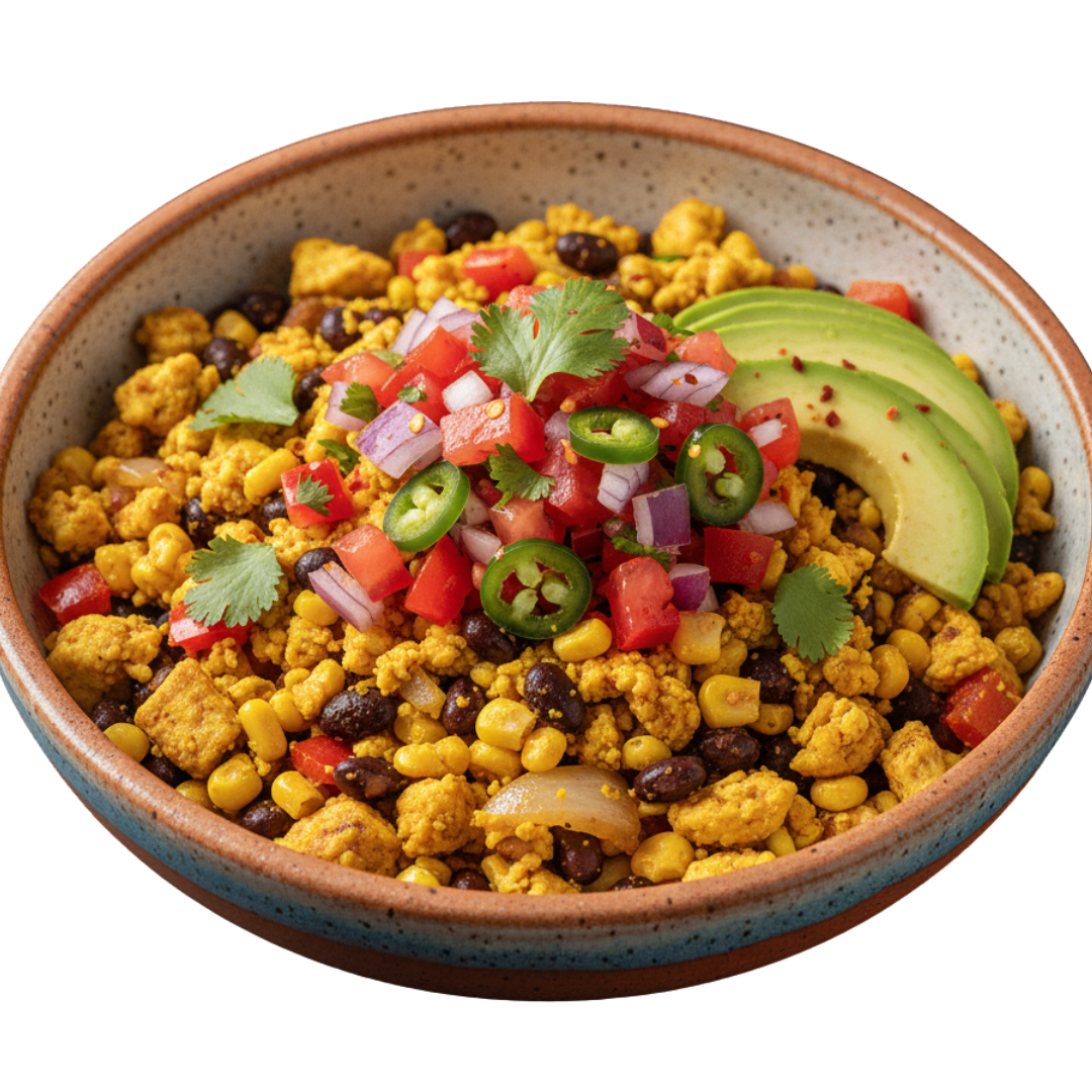 Nuestro revuelto de tofu con cúrcuma y especias, acompañado de frijoles negros, maíz, pico de gallo y aguacate sobre una base de quinoa.