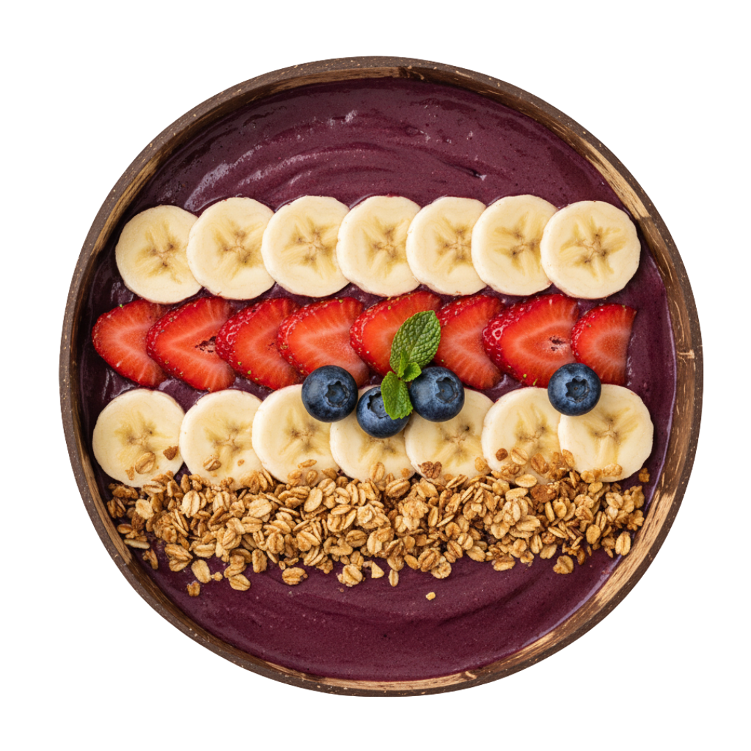 Un bowl energizante de pulpa de açaí orgánico, mezclado con plátano y cubierto con granola casera, fruta de temporada y semillas de chía.