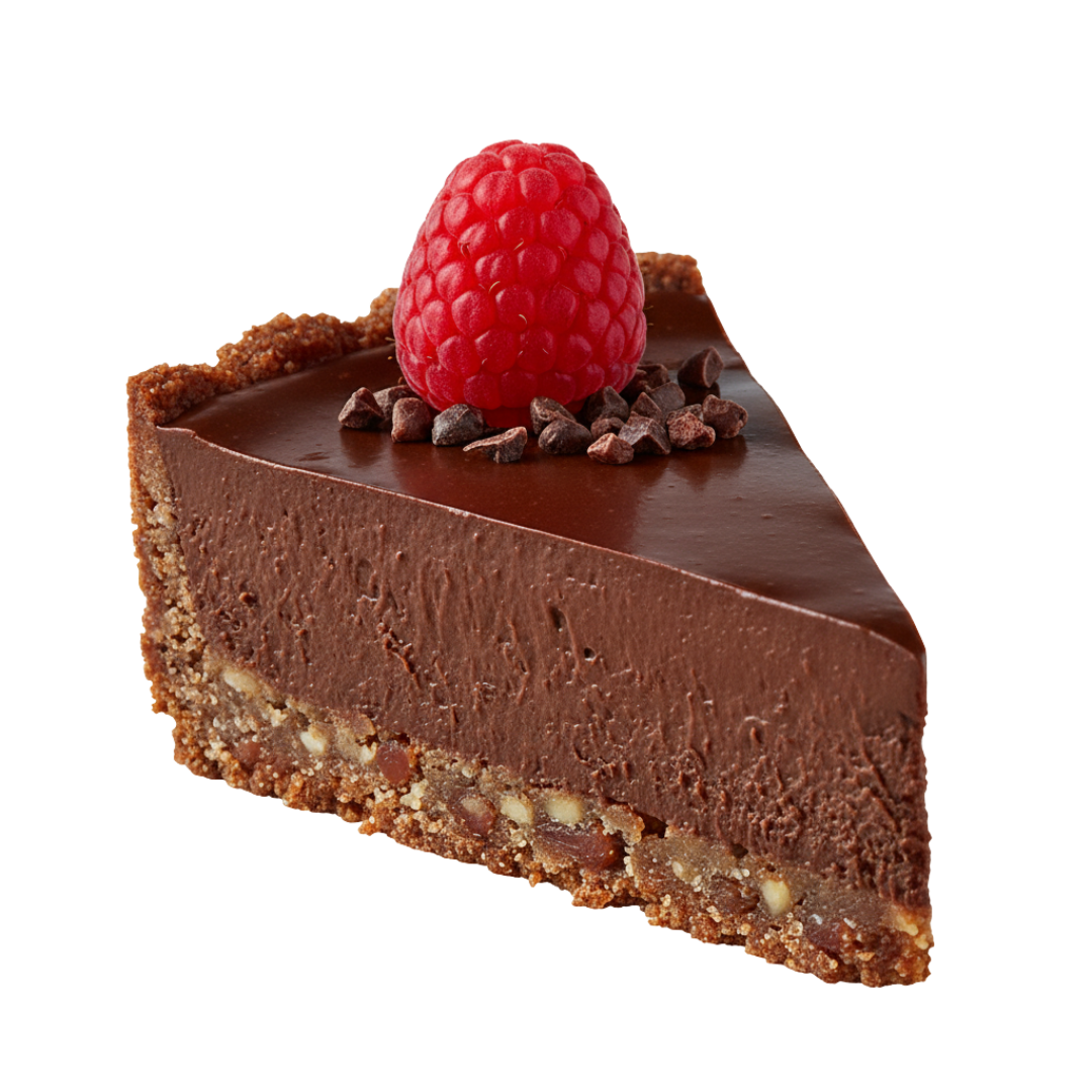 Una porción de tarta increíblemente cremosa y decadente, con una base de frutos secos y un mousse de chocolate y aguacate sin azúcares refinados.